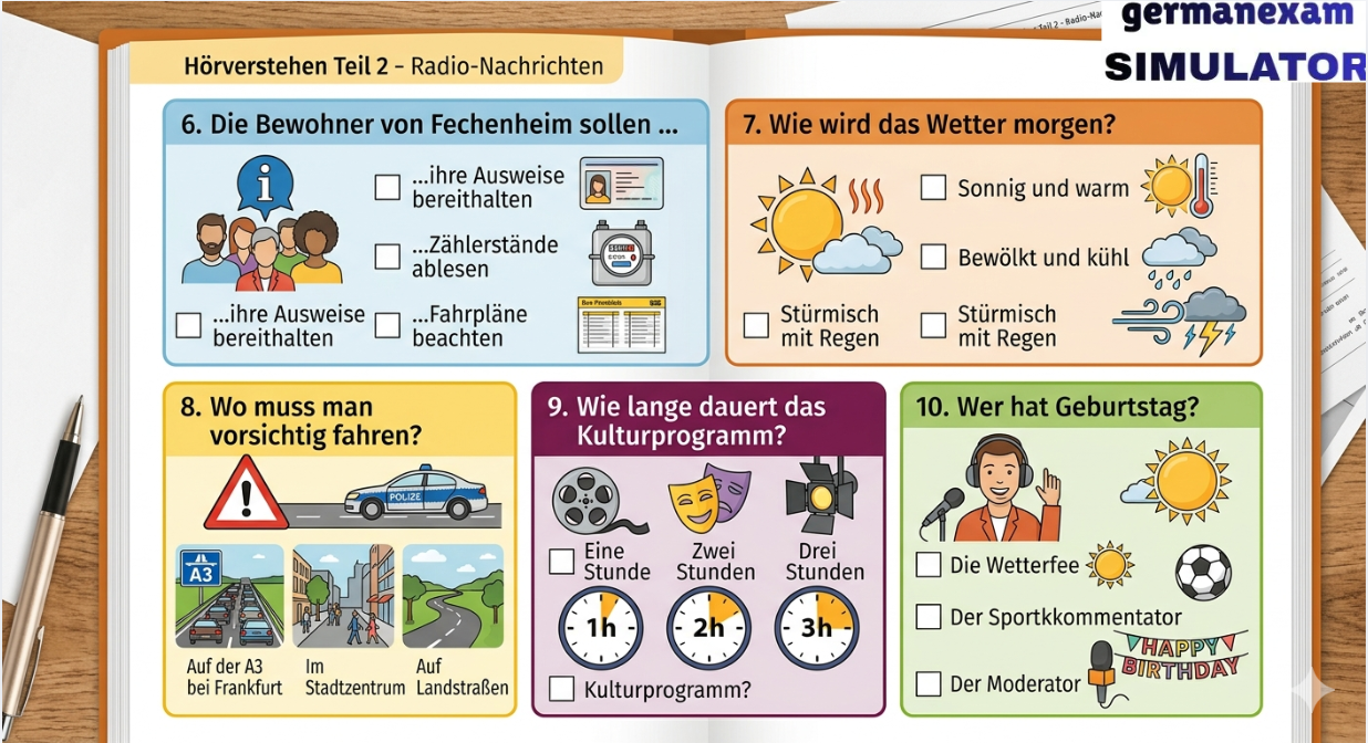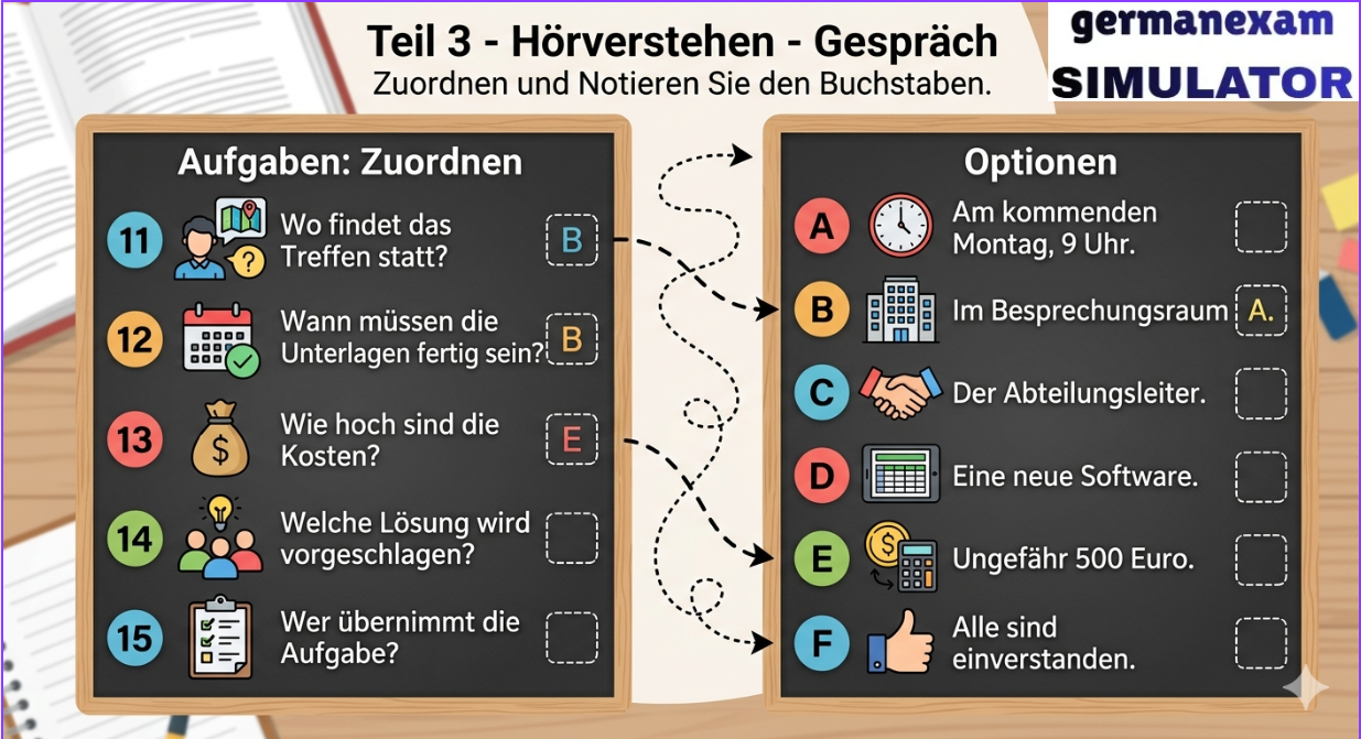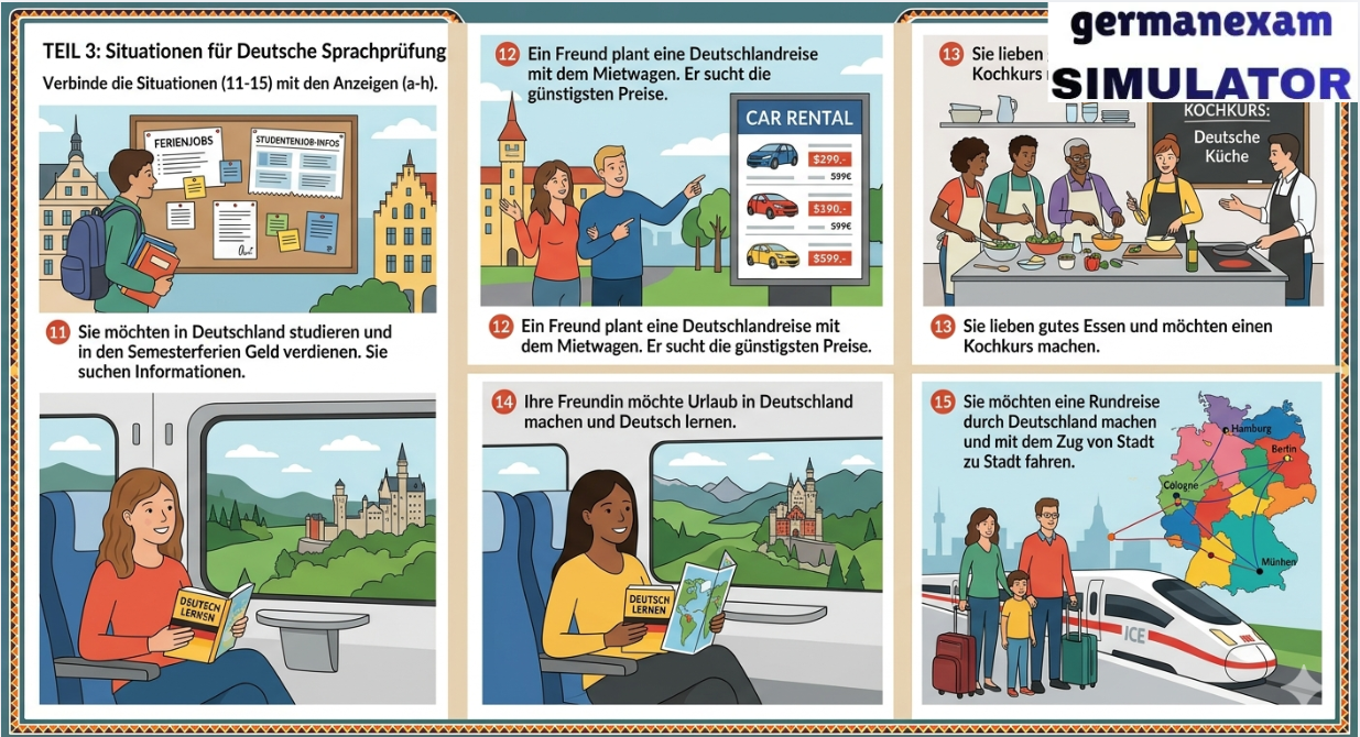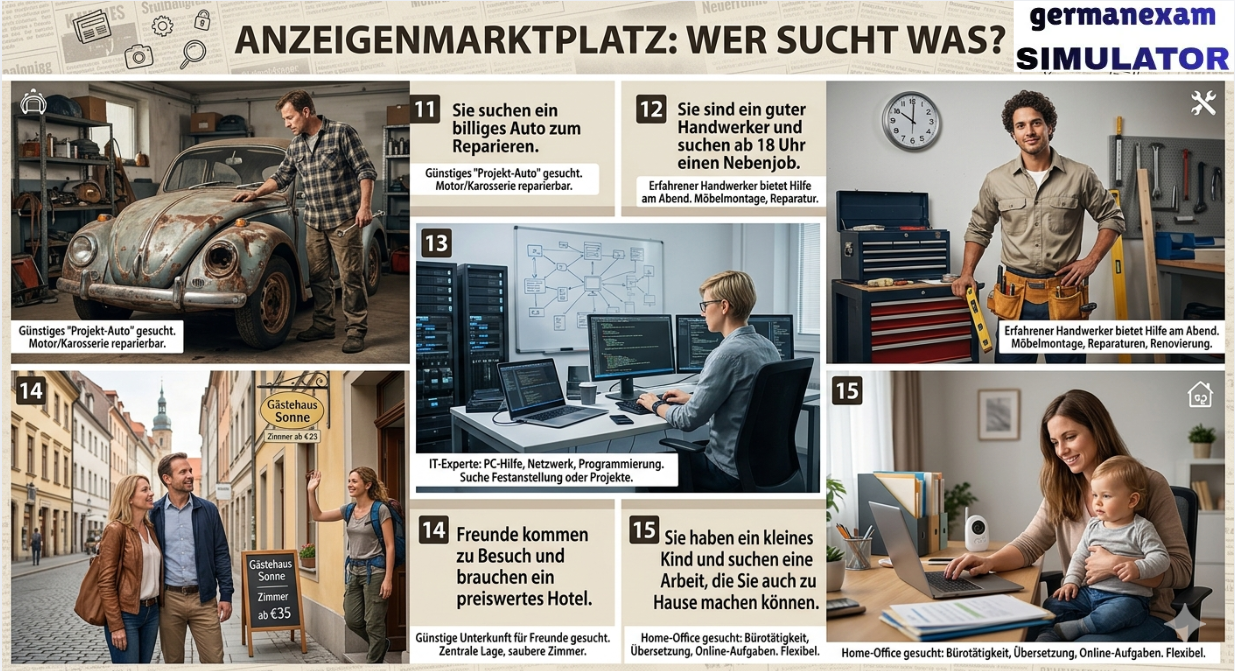 📚 Attempt Free Lesen Test.. 👉 Download Free PDF Teil 3Lesen Sie die Anzeigen a-h und die Aufgaben 11-15. Welche Anzeige passt zu welcher Situation? Für eine Aufgabe gibt es keine Lösung. Schreiben Sie hier den Buchstaben X.11 Sie suchen ein billiges Auto zum Reparieren.12 Sie sind ein guter Handwerker und suchen ab 18 Uhr einen Nebenjob.13 Sie kennen sich sehr gut mit Computern aus und suchen Arbeit.14 Freunde kommen zu Besuch und brauchen ein preiswertes Hotel.15 Sie haben ein kleines Kind und suchen eine Arbeit, die Sie auch zu Hause machen können 📚 Attempt Free Lesen Test.. Prepare for German Exams Effectively Using German Exam Simulator.843900008684390000877055710004German Exam Simulation323 GMS Road, Near Ballupur Chowk, Dehradun, IndiaEmail: info@ieltsband7.com