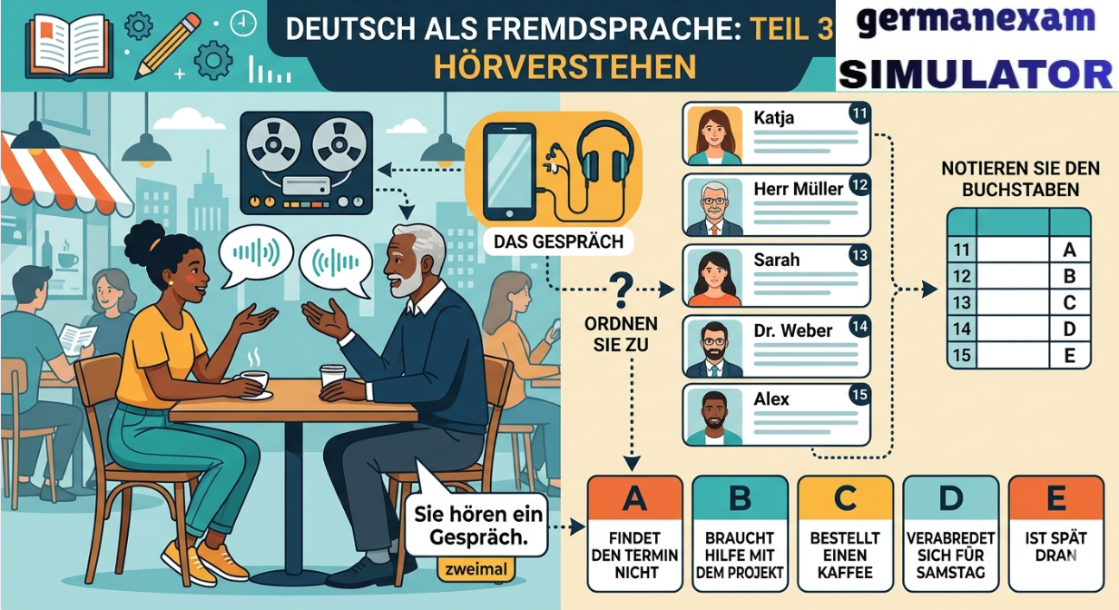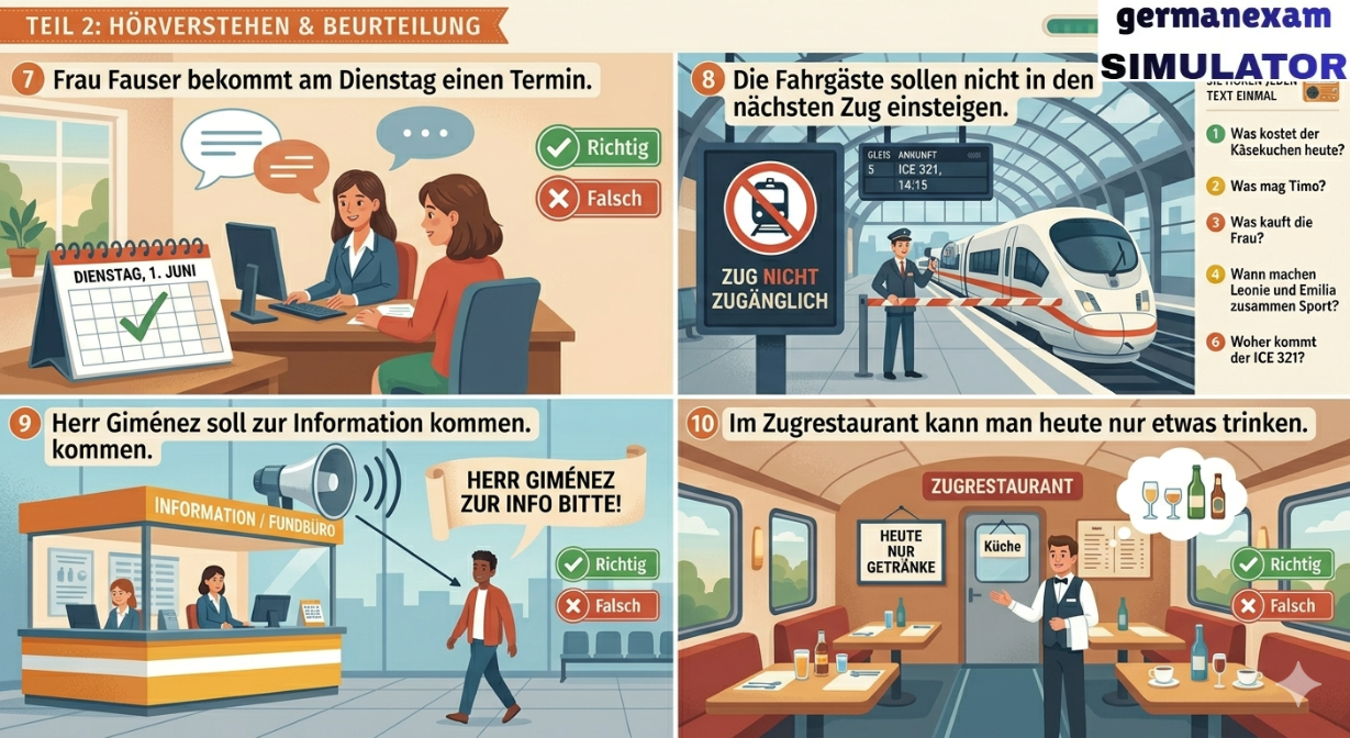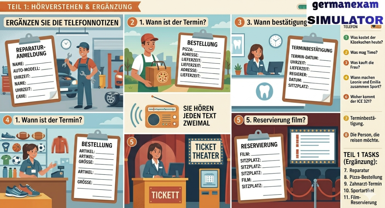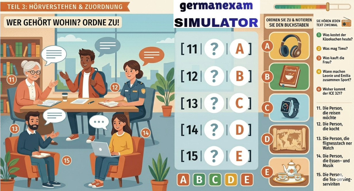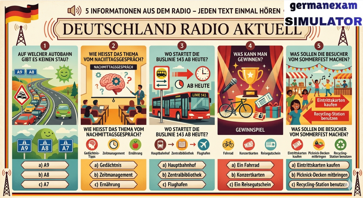 📚 Attempt Free Hören Test.. 👉 Download Free PDF Teil 2Sie hören fünf Informationen aus dem Radio. Zu jedem Text gibt es eine Aufgabe. Kreuzen Sie an: a, b oder c. Sie hören jeden Text einmal.[audio mp3="https://germanexamsimulator.com/wp-content/uploads/2026/03/start-deutsch-2-horen-modelltest-2023-mit-losung-am-ende-vid-154-guru-talks-1_w6T1Xt75.mp3"][/audio]6 Was kommt um 14 Uhr?7 Was ist das Problem mit dem Verkehr?8 Wie wird das Wetter morgen?9 Wie kommt man vom Hauptbahnhof zum Westkreuz?10 Welche Telefonnummer soll man anrufen? 📚 Attempt Free Hören Test.. Prepare for German Exams Effectively Using German Exam Simulator.843900008684390000877055710004German Exam Simulation323 GMS Road, Near Ballupur Chowk, Dehradun, IndiaEmail: info@ieltsband7.com