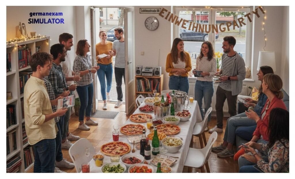 endlich haben wir seit zwei Tagen eine neue Wohnung. Morgen möchten wir um 19 Uhr eine Einweihungsparty machen. Viele Leute kommen, die Nachbarn hier sind sehr nett. Habt ihr Lust zur Party zu kommen? Wir haben schon Essen und Getränke gekauft. Bringt bitte einige Musik-CDs, dann können wir zusammen Musik hören. Unsere Adresse ist Leibnizstraße 68, Erdgeschoss.